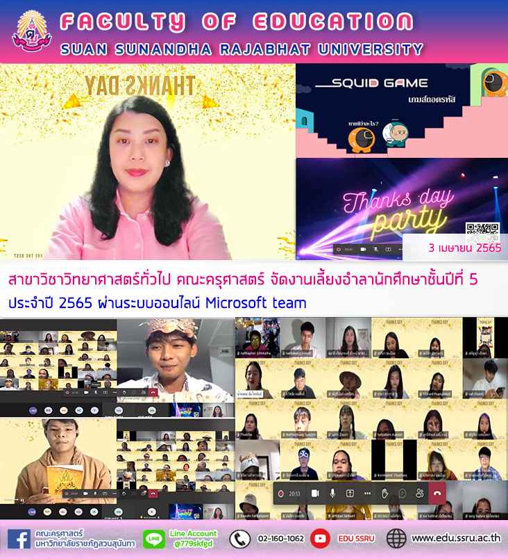 สาขาวิชาวิทยาศาสตร์ทั่วไป คณะครุศาสตร์ จัดงานเลี้ยงอำลานักศึกษาชั้นปีที่ 5 ประจำปี 2565 ได้รับเกียรติจาก ผู้ช่วยศาสตราจารย์ ดร. สุมาลี เทียนทองดี หัวหน้าสาขาวิชาวิทยาศาสตร์ทั่วไป เป็นประธานกล่าวเปิดงาน โดยมีคณาจารย์ประจำสาขาวิทยาศาสตร์ทั่วไปได้กล่าวขอบคุณและอวยพรแก่นักศึกษาชั้นปีที่ 5 ในวันที่ 3 เมษายน 2565 ผ่านระบบออนไลน์ Microsoft team จัดโดยนักศึกษาชั้นปีที่ 4