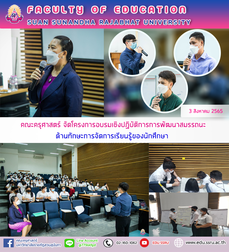 วันที่ 3 สิงหาคม 2565 คณะครุศาสตร์ มหาวิทยาลัยราชภัฏสวนสุนันทา จัดโครงการอบรมเชิงปฏิบัติการการพัฒนาสมรรถนะ ด้านทักษะการจัดการเรียนรู้ของนักศึกษาคณะครุศาสตร์ โดยได้รับเกียรติจาก อาจารย์รัฐพงศ์ วงค์เขื่อนแก้ว อาจารย์ศราวุธ รามศรี และอาจารย์ณฐพล อยู่เป็นสุข เป็นวิทยากรบรรยายในหัวข้อเรื่อง “การออกแบบการจัดการเรียนรู้วิทยาศาสตร์โดยใช้ STEM เพื่อพัฒนาสมรรถนะผู้เรียน” ให้กับนักศึกษาสาขาวิทยาศาสตร์ทั่วไป ผู้รับผิดชอบโครงการได้แก่ผู้ช่วยศาสตราจารย์ ดร. บุญฤดี อุดมผล ร่วมกับ ผู้ช่วยศาสตราจารย์ ดร.สุมาลี เทียนทองดี หัวหน้าสาขาวิทยาศาสตร์ทั่วไป ณ ห้องเรียน 1137