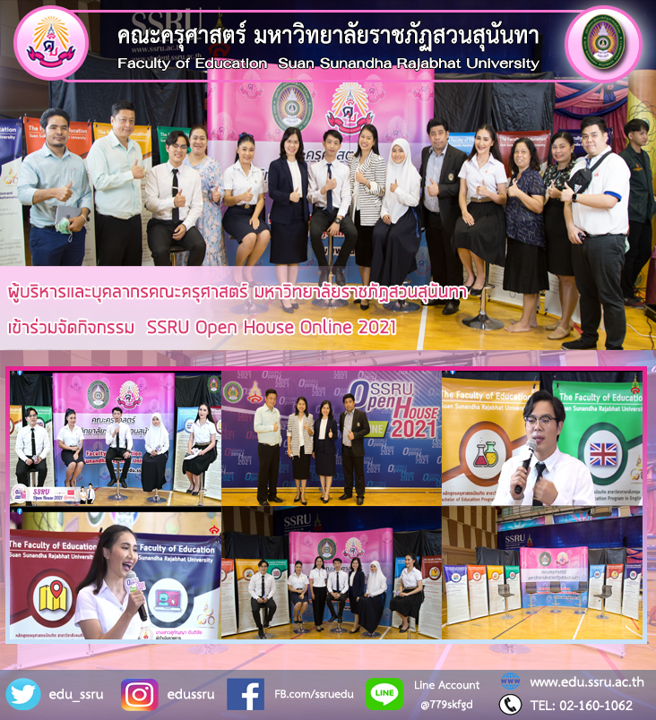 วันที่ 31 มีนาคม 2564 นำโดย ผู้ช่วยศาสตราจารย์ ดร.กรรณิการ์ ภิรมย์รัตน์ คณบดีคณะครุศาสตร์ มหาวิทยาลัยราชภัฏสวนสุนันทา พร้อมด้วยผู้บริหารและบุคลากรของคณะฯ เข้าร่วมจัดกิจกรรม SSRU Open House Online 2021 ณ อาคารศูนย์สุขภาพและกีฬาสวนสุนันทา ชั้น 4 มหาวิทยาลัยราชภัฏสวนสุนันทา