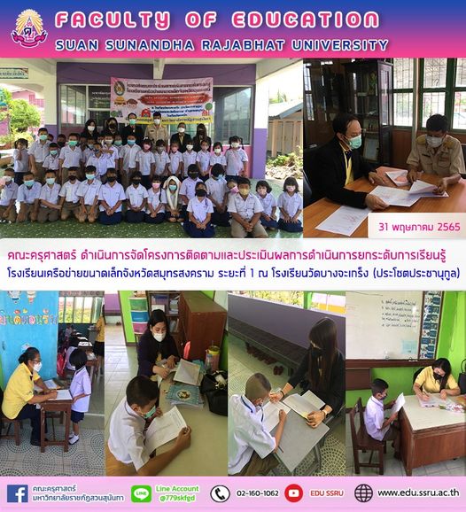 อาจารย์ ดร.ธีราภรณ์ พลายเล็ก รองคณบดีฝ่ายวิจัยและบริการวิชาการ ผู้รับผิดชอบโครงการ พร้อมด้วย อาจารย์ ภาณุวัฒน์ ศิวะสกุลราช หัวหน้ากลุ่มวิชาชีพครู อาจารย์ ณัฐกา สุทธิธนกูล อาจารย์ กุลทราภรณ์ สุพงษ์ อาจารย์ เพียงฤทัย พุฒิคุณเกษม อาจารย์ สุทธิพร แท่นทอง อาจารย์ประจำคณะครุศาสตร์ ดำเนินการจัดโครงการติดตามและประเมินผลการดำเนินการยกระดับการเรียนรู้โรงเรียนเครือข่ายขนาดเล็กจังหวัดสมุทรสงคราม ระยะที่ 1 โดยได้รับเกียรติจาก ผู้อำนวยการโรงเรียนวัดบางจะเกร็ง (ประโชตประชานุกูล) บรรยายพิเศษ เรื่อง “ ความสำคัญของการพัฒนาทักษะการอ่านและการเขียนและคุณธรรมจริยธรรมของนักเรียนระดับประถมศึกษา ” และคณะดำเนินงาน อภิปรายในภาคเช้า เรื่อง “ ผลการใช้นวัตกรรมทางการศึกษาเพื่อส่งเสริมคุณธรรมจริยธรรมของนักเรียน ” และ อภิปรายในภาคบ่าย เรื่อง “ การส่งเสริมคุณธรรมจริยธรรมของนักเรียนในระดับประถมศึกษา ” เมื่อวันที่ 30 พฤษภาคม 2565 ณ โรงเรียนวัดบางจะเกร็ง (ประโชตประชานุกูล)