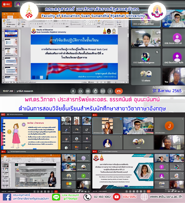 เมื่อวันที่ 30 สิงหาคม 2565 ผู้ช่วยศาสตราจารย์ ดร.วิภาดา ประสารทรัพย์ อาจารย์ ดร. ธรรศนันต์ อุนนะนันทน์ อาจารย์สาขาวิชาภาษาอังกฤษ และผู้ช่วยศาสตราจารย์ ดร.สุทธิพงศ์ บุญผดุง ผู้เชี่ยวชาญด้านการวิจัย คณะครุศาสตร์ มหาวิทยาลัยราชภัฏสวนสุนันทา ดำเนินการสอบวิจัยชั้นเรียนสำหรับนักศึกษาสาขาวิชาภาษาอังกฤษชั้นปีที่ 4 และ ชั้นปีที่ 5 เพื่อประเมินงานวิจัย พร้อมทั้งได้ร่วมกันให้คำแนะนำเพื่อการพัฒนาต่อไป โดยการสอบในครั้งนี้ได้ดำเนินการสอบผ่านระบบออนไลน์