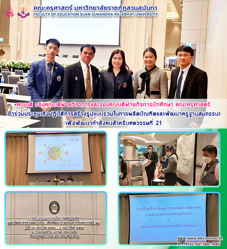 วันที่ 31 มกราคม 2566 เวลา 10.30 - 17.00 น. นำโดย ผู้ช่วยศาสตราจารย์ ดร.กรรณิการ์ ภิรมย์รัตน์ คณบดีคณะครุศาสตร์ พร้อมด้วย ผู้ช่วยศาสตราจารย์ ดร. ทัศนีย์ เศรษฐพงษ์ รองคณบดีฝ่ายวิชาการ ผู้ช่วยศาสตราจารย์ สงกรานณ์ ขุนทิพยท์ทอง รองคณบดีฝ่ายกิจการนักศึกษา และนักศึกษาศิษย์เก่า เข้าร่วมประชุมเชิงปฏิบัติการสร้างรูปแบบร่วมในการผลิตบัณฑิตและพัฒนาครูฐานสมถรรนะเพื่อพัฒนากำลังคนสำหรับศตวรรษที่ 21 ณ โรงแรมอัศวิน แกรนด์ คอนเวนชั่น กรุงเทพฯ