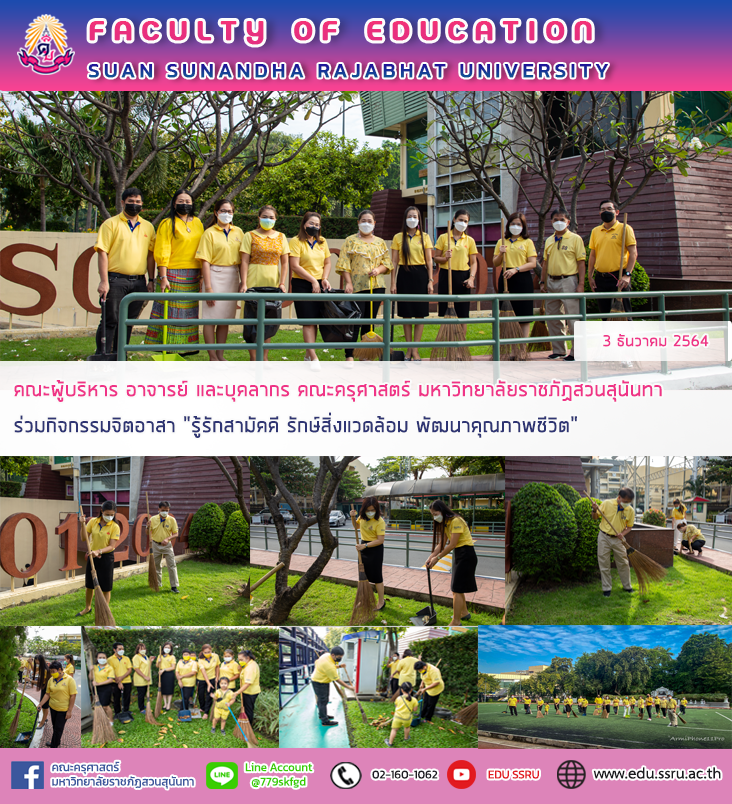 วันที่ 3 ธันวาคม 2564 ผู้ช่วยศาสตราจารย์ ดร.กรรณิการ์ ภิรมย์รัตน์ คณบดีคณะครุศาสตร์ มหาวิทยาลัยราชภัฏสวนสุนันทา นำทีม ผู้บริหาร และบุคลากรของคณะฯ ร่วมกิจกรรมจิตอาสา “รู้รักสามัคคี รักษ์สิ่งแวดล้อม พัฒนาคุณภาพชีวิต” เนื่องในวันคล้ายวันพระราชสมภพ พระบาทสมเด็จพระบรมชนกาธิเบศร มหาภูมิพลอดุลยเดชมหาราช บรมนาถบพิตร วันชาติ และวันพ่อแห่งชาติ ณ บริเวณ สนามหญ้าเทียม และอาคาร 11 คณะครุศาสตร์