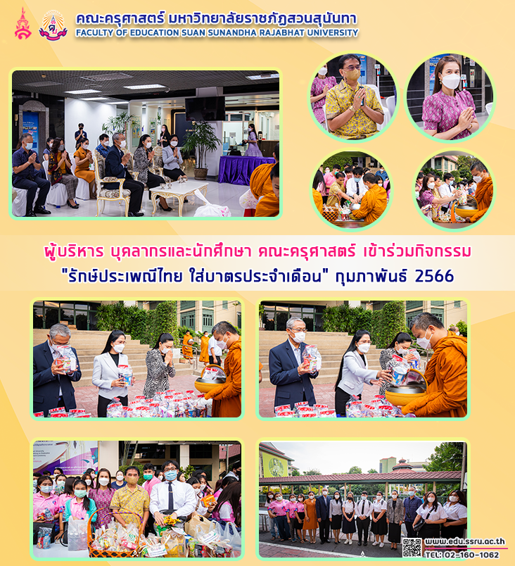 วันที่ 3 กุมภาพันธ์ 2566 เวลา 07.00 น. คณะครุศาสตร์ มหาวิทยาลัยราชภัฏสวนสุนันทา นำโดย ผู้ช่วยศาสตราจารย์สงกรานณ์ ขุนทิพย์ทอง รองคณบดีฝ่ายกิจการนักศึกษา อาจารย์ ดร. ธีราภรณ์ พลายเล็ก รองคณบดีฝ่ายวิจัยและบริการวิชาการ พร้อมด้วยบุคลากรและนักศึกษา เข้าร่วมกิจกรรม รักษ์ประเพณีไทย ใส่บาตรประจำเดือนกุมภาพันธ์ 2566 โดยมี รองศาสตราจารย์ ดร.ชุติกาญจน์ ศรีวิบูลย์ อธิการบดี มหาวิทยาลัยราชภัฏสวนสุนันทา เป็นประธานในพิธีถวายภัตตาหาร และใส่บาตรข้าวสาว อาหารแห้ง ให้แด่พระภิกษุสงฆ์ จำนวน 9 รูป ซึ่งกิจกรรมนี้จัดโดยกองพัฒนานักศึกษา ณ บริเวณหน้าอาคารกองพัฒนานักศึกษา