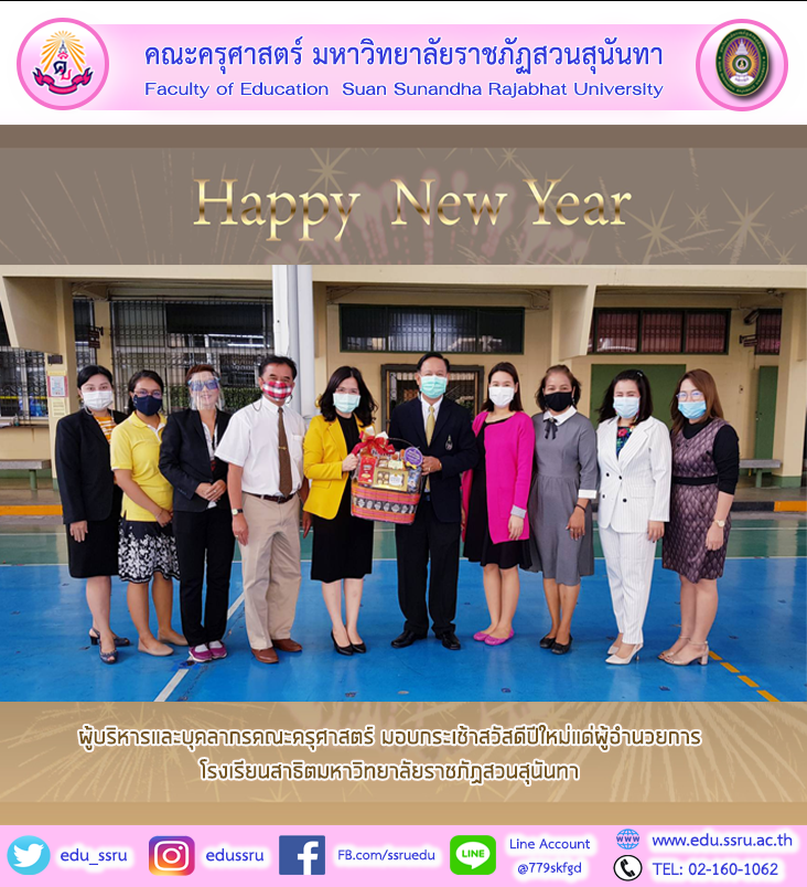 วันที่ 4 มกราคม 2564 ผู้ช่วยศาสตราจารย์ ดร.กรรณิการ์ ภิรมย์รัตน์ คณบดีคณะครุศาสตร์ มหาวิทยาลัยราชภัฏสวนสุนันทา พร้อมด้วยบุคลากร มอบกระเช้าสวัสดีใหม่แด่ รองศาสตราจารย์ ดร.สมเกียรติ กอบัวแก้ว ผู้อำนวยการโรงเรียนสาธิตมหาวิทยาลัยราชภัฏสวนสุนันทา