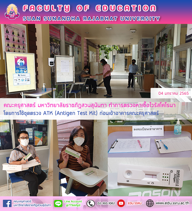 วันที่ 4 มกราคม 2565 คณะครุศาสตร์ มหาวิทยาลัยราชภัฏสวนสุนันทา ได้ดำเนินตามแนวทางการปฏิบัติงานและแนวทางการจัดการเรียนการสอนภายหลังเทศกาลปีใหม่ ทำการตรวจการหาเชื้อไวรัสโคโรนา 2019 (COVID-19) โดยการใช้ชุดตรวจ ATK (Antigen Test Kit) สำหรับบุคลากรก่อนเข้ามาภายในอาคารคณะครุศาสตร์ เพื่อป้องกันการแพร่ระบาดตามกรมควบคุมโรค กระทรวงสาธารณะสุข