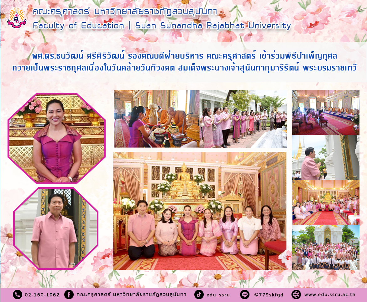 เมื่อวันที่ 31 พฤษภาคม 2568 เวลา 13.00 น. ผู้ช่วยศาสตราจารย์ ดร. ธนวัฒน์ ศรีศิริวัฒน์ รองคณบดีฝ่ายบริหาร คณะครุศาสตร์ มหาวิทยาลัยราชภัฏสวนสุนันทา เข้าร่วมพิธีบำเพ็ญกุศลถวายเป็นพระราชกุศลเนื่องในวันคล้ายวันทิวงคต สมเด็จพระนางเจ้าสุนันทากุมารีรัตน์ พระบรมราชเทวี เนื่องในวันคล้ายวันทิวงคตครบรอบ ๑๓๗ ปี จัดโดยสำนักศิลปะและวัฒนธรรม โดยมีรองศาสตราจารย์ ดร.ชุติกาญจน์ ศรีวิบูลย์ อธิการบดีมหาวิทยาลัยราชภัฏสวนสุนันทา เป็นประธานในพิธี ณ สุสานหลวง วัดราชบพิธสถิตมหาสีมาราม