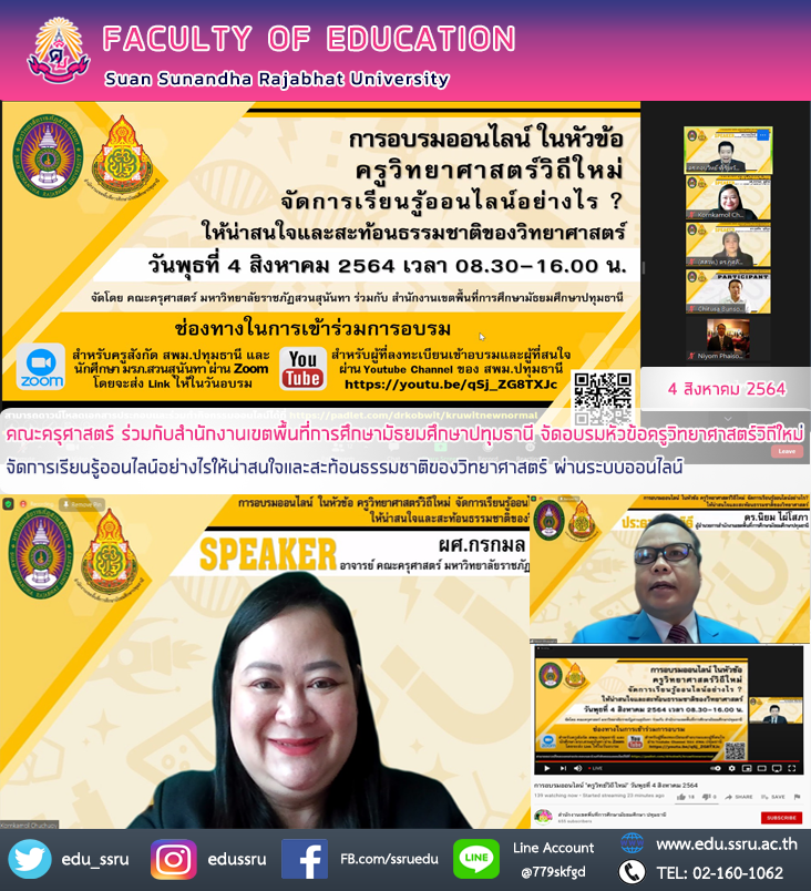 วันที่ 4 สิงหาคม 2564 คณะครุศาสตร์ มหาวิทยาลัยราชภัฏสวนสุนันทา ร่วมกับสำนักงานเขตพื้นที่การศึกษามัธยมศึกษาปทุมธานี (สพม.) จ.ปทุมธานี จัดอบรมหัวข้อ “ครูวิทยาศาสตร์วิถีใหม่ จัดการเรียนรู้ออนไลน์อย่างไร ให้น่าสนใจและสะท้อนธรรมชาติของวิทยาศาสตร์” ผ่านระบบออนไลน์ Zoom conference และ Youtube Channel ของ สพม.ปทุมธานี
