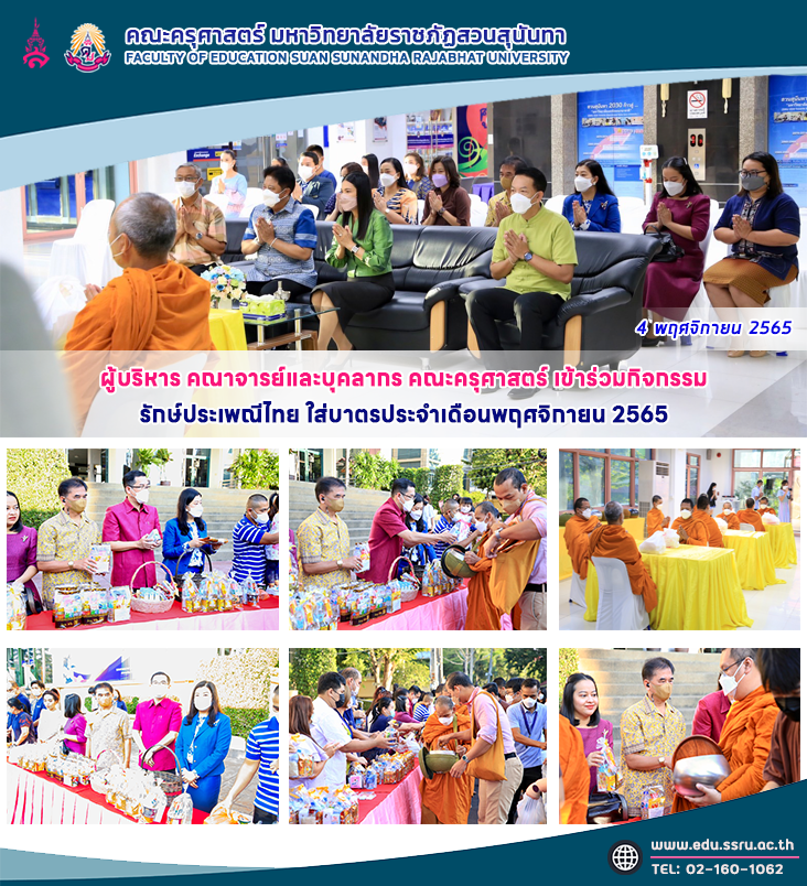 วันศุกร์ที่ 4 พฤศจิกายน 2565 เวลา 07.00 น. คณะครุศาสตร์ มหาวิทยาลัยราชภัฏสวนสุนันทา นำโดย ผู้ช่วยศาสตราจารย์สงกรานณ์ ขุนทิพย์ทอง รองคณบดีฝ่ายกิจการนักศึกษา อาจารย์วีรพจน์ รัตนวาร รองคณบดีฝ่ายบริหาร ผู้ช่วยศาสตราจารย์ ดร.สุมาลี เทียนทองดี หัวหน้าสาขาวิชาวิทยาศาสตร์ทั่วไป และบุคลากรของคณะฯ เข้าร่วมกิจกรรม รักษ์ประเพณีไทย ใส่บาตรประจำเดือนพฤศจิกายน 2565 โดยมี รองศาสตราจารย์ ดร.ชุติกาญจน์ ศรีวิบูลย์ อธิการบดี มหาวิทยาลัยราชภัฏสวนสุนันทา เป็นประธานในพิธีถวายภัตตาหาร และใส่บาตรข้าวสาว อาหารแห้ง ให้แด่คณะสงฆ์จากวัดราชาธิวาสวิหาร จำนวน 9 รูป ซึ่งกิจกรรมนี้จัดโดยกองพัฒนานักศึกษา ณ อาคารศูนย์สุขภาพและกีฬาสวนสุนันทา ชั้น 1