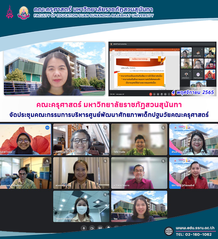 วันศุกร์ที่ 4 พฤศจิกายน 2565 เวลา 09.00 น. คณะครุศาสตร์ มหาวิทยาลัยราชภัฏสวนสุนันทา นำโดย ผู้ช่วยศาสตราจารย์ ดร.กรรณิการ์ ภิรมย์รัตน์ คณบดีคณะครุศาสตร์ อาจารย์วีรพจน์ รัตนวาร รองคณบดีฝ่ายบริหาร ผู้ช่วยศาสตราจารย์สงกรานณ์ ขุนทิพย์ทอง รองคณบดีฝ่ายกิจการนักศึกษา อาจารย์ ดร.ดวงกมล จงเจริญ ผู้อำนวยการศูนย์พัฒนาวิชาชีพทางการศึกษา ผู้ช่วยศาสตราจารย์ สุพันธ์วดี ไวยรูป ผู้อำนวยการศูนย์พัฒนาศักยภาพเด็กปฐมวัย อาจารย์ธิติกาญจน์ ฐิติโสภณศักดิ์ หัวหน้าสาขาวิชาการศึกษาปฐมวัย และอาจารย์สาขาวิชาการศึกษาปฐมวัย จัดประชุมคณะกรรมการบริหารศูนย์พัฒนาศักยภาพเด็กปฐมวัยคณะครุศาสตร์ ผ่านระบบออนไลน์ Google Meet เพื่อชี้แจงและติดตามผลการดำเนินงานสอน