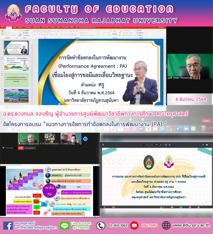 วันที่ 4 ธันวาคม 2564 อาจารย์ ดร.ดวงกมล จงเจริญ ผู้อำนวยการศูนย์พัฒนาวิชาชีพทางการศึกษา จัดโครงการอบรมแนวทางการจัดการทำข้อตกลงในการพัฒนางาน (PA) โดยมี อาจารย์กิตติ กสิณธารา ศึกษานิเทศเชี่ยวชาญ เป็นวิทยากร