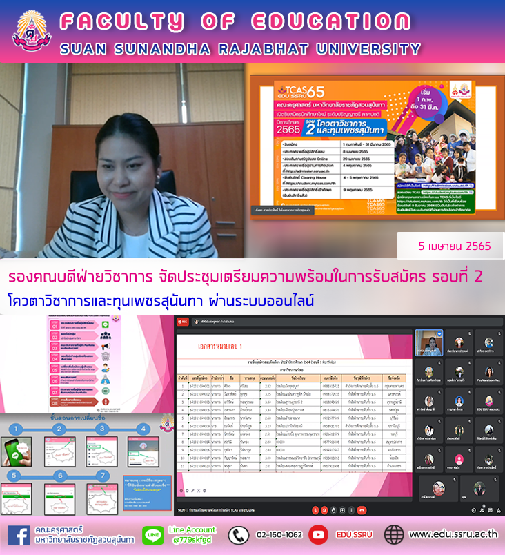 ผู้ช่วยศาสตราจารย์ ดร. ทัศนีย์ เศรษฐพงษ์ รองคณบดีฝ่ายวิชาการ จัดประชุมเตรียมความพร้อมในการรับสมัคร รอบที่ 2 โควตาวิชาการและทุนเพชรสุนันทา ในวันที่ 4 เมษายน 2565 เวลา 14.00น. ผ่านระบบออนไลน์