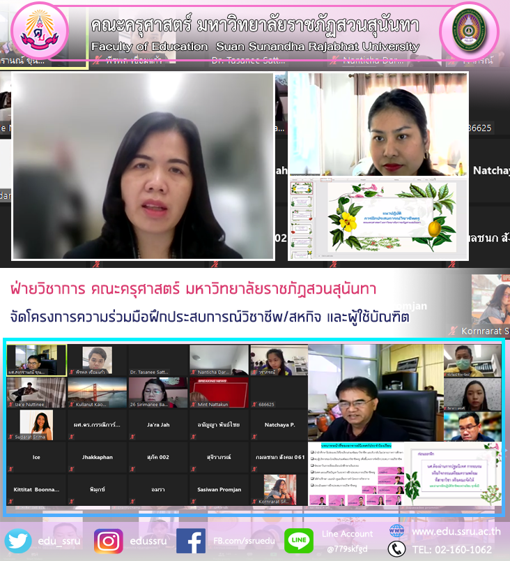วันที่ 5 พฤษภาคม 2564 นำโดย ผู้ช่วยศาสตราจารย์ ดร.กรรณิการ์ ภิรมย์รัตน์ คณบดี ผู้ช่วยศาสตราจารย์ ดร.ทัศนีย์ เศรษฐพงศ์ รองคณบดีฝ่ายวิชาการ และผู้ช่วยศาสตราจารย์สงกรานณ์ ขุนทิพย์ทอง รองคณบดีฝ่ายกิจการนักศึกษา คณะครุศาสตร์ มหาวิทยาลัยราชภัฏสวนสุนันทา จัดโครงการความร่วมมือฝึกประสบการณ์วิชาชีพ/สหกิจ และผู้ใช้บัณฑิต กิจกรรมปฐมนิเทศนักศึกษาฝึกประสบการณ์วิชาชีพ เพื่อชี้แจ้งแนวทางการปฏิบัติการฝึกประสบการณ์วิชาชีพ ผ่านระบบออนไลน์