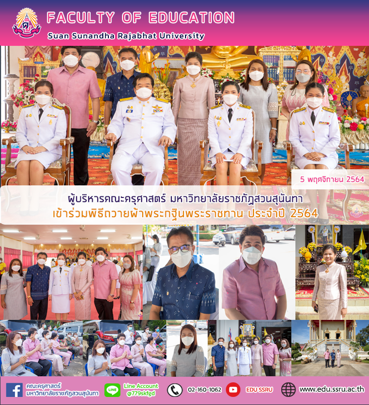วันที่ 5 พฤศจิกายน 2564 คณะครุศาสตร์ มหาวิทยาลัยราชภัฏสวนสุนันทา นำโดย ผู้ช่วยศาสตราจารย์ ดร.กรรณิการ์ ภิรมย์รัตน์ คณบดีคณะครุศาสตร์ พร้อมด้วย ผู้ช่วยศาสตราจารย์ ดร.ทัศนีย์ เศรษฐพงษ์ รองคณบดีฝ่ายวิชาการ อาจารย์ ดร.ศิลป์ชัย พูลคล้าย รองคณบดีฝ่ายบริหาร ผู้ช่วยศาสตราจารย์สงกรานณ์ ขุนทิพย์ทอง รองคณบดีฝ่ายกิจการนักศึกษา และบุคลากรคณะครุศาสตร์ เข้าร่วมพิธีถวายผ้าพระกฐินพระราชทาน ประจำปี 2564 โดยมี รองศาสตราจารย์ ดร.ชุติกาญจน์ ศรีวิบูลย์ อธิการบดีมหาวิทยาลัยราชภัฏสวนสุนันทา เป็นประธานในพิธี พร้อมด้วยคณะผู้บริหารของมหาวิทยาลัย เข้าร่วมถวายผ้าพระกฐินพระราชทาน พร้อมเครื่องอัฐบริขารและปัจจัย ถวายเป็นพระราชกุศล โดยมี พระอรรถโมลี เจ้าอาวาสวัดไผ่ล้อม เป็นประธานฝ่ายสงฆ์ ณ วัดไผ่ล้อมพระอารามหลวง ตำบลจันทนิมิต อำเภอเมือง จังหวัดจันทบุรี