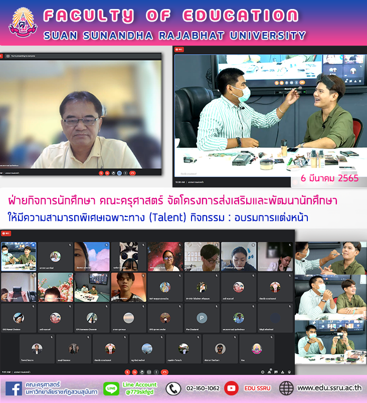 วันที่ 6 มีนาคม 2565 ฝ่ายกิจการนักศึกษา คณะครุศาสตร์ นำโดย ผู้ช่วยศาสตราจารย์ สงกรานณ์ ขุนทิพย์ทอง รองคณบดีฝ่ายกิจการนักศึกษา จัดโครงการส่งเสริมและพัฒนานักศึกษาให้มีความสามารถพิเศษเฉพาะทาง (Talent)และทักษะอื่นๆ กิจกรรม: อบรมการแต่งหน้า ผ่านระบบออนไลน์ Google Meet โดยได้รับเกียรติจาก นักศึกษาศิษย์เก่าของคณะฯ นายมิ่งมงคล เอี่ยมเสริมลาภ นายจิรายุ พะวัน และนายนทณัฐ เจริญพูล มาเป็นวิทยากรในการสาธิตและบรรยาย