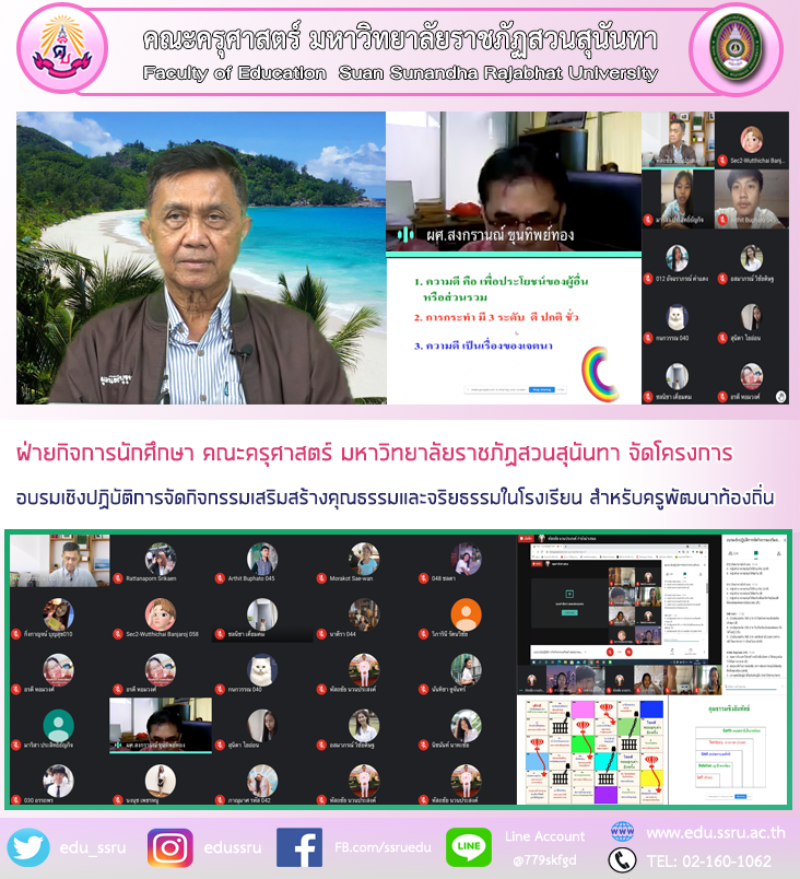 วันที่ 6 พฤษภาคม 2564 นำโดย ผู้ช่วยศาสตราจารย์สงกรานณ์ ขุนทิพย์ทอง รองคณบดีฝ่ายกิจการนักศึกษา คณะครุศาสตร์ มหาวิทยาลัยราชภัฏสวนสุนันทา จัดโครงการอบรมเชิงปฏิบัติการจัดกิจกรรมเสริมสร้างคุณธรรมและจริยธรรมในโรงเรียน สำหรับครูพัฒนาท้องถิ่น ผ่านระบบออนไลน์ โดยได้รับเกียรติจาก พลเอกศรุต นาควัชระ เป็นวิทยากร