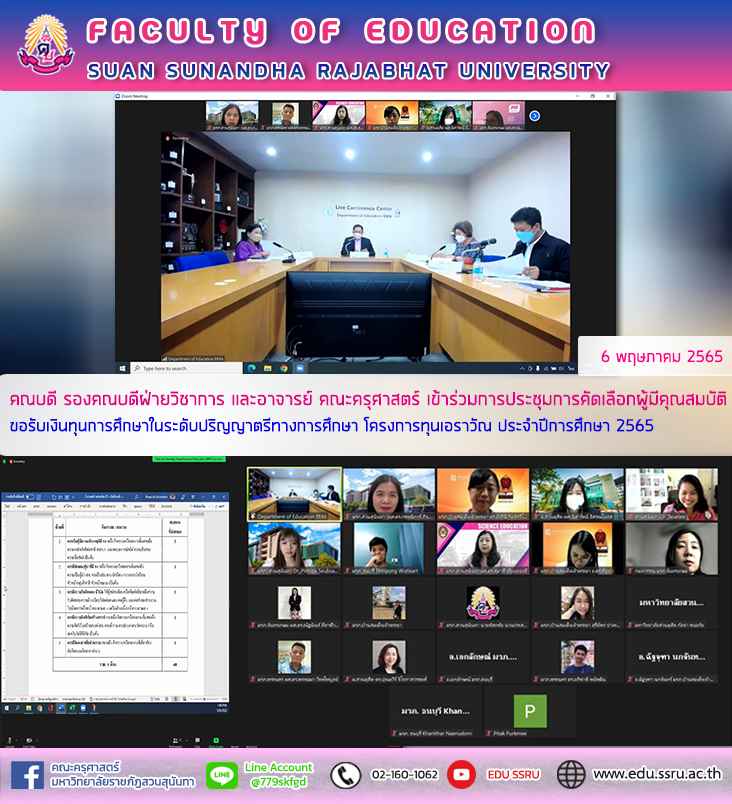 ผู้ช่วยศาสตราจารย์ ดร. กรรณิการ์ ภิรมย์รัตน์ คณบดี ผู้ช่วยศาสตราจารย์ ดร. ทัศนีย์ เศรษฐพงษ์ รองคณบดีฝ่ายวิชาการ พร้อมด้วย ผู้ช่วยศาสตราจารย์ ดร. สุมาลี เทียนทองดี หัวหน้าสาขาวิชาวิทยาศาสตร์ทั่วไป และ อาจารย์ ดร. พิณทิพา สืบแสง หัวหน้าสาขาวิชาภาษาอังกฤษ คณะครุศาสตร์ เข้าร่วมการประชุมการคัดเลือกผู้มีคุณสมบัติขอรับเงินทุนการศึกษาในระดับปริญญาตรีทางการศึกษา โครงการทุนเอราวัณ ประจำปีการศึกษา 2565 ในวันศุกร์ ที่ 6 พฤษคม 2565 เวลา 13.30 น. เป็นต้นไป ผ่านระบบออนไลน์ Zoom
