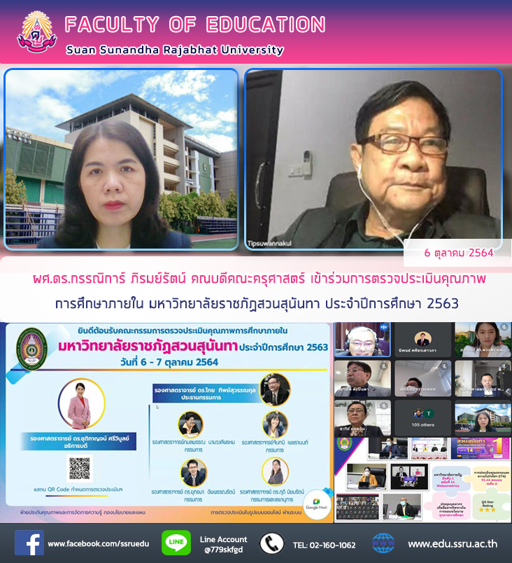 วันที่ 6 ตุลาคม 2564 ผู้ช่วยศาสตราจารย์ ดร.กรรณิการ์ ภิรมย์รัตน์ คณบดีคณะครุศาสตร์ มหาวิทยาลัยราชภัฏสวนสุนันทา พร้อมด้วย รองศาสตราจารย์ ดร.ชุติกาญจน์ ศรีวิบูลย์ อธิการบดีมหาวิทยาลัยราชภัฏสวนสุนันทา รองศาสตราจารย์ ดร.วิทยา เมฆขำ รองอธิการบดีฝ่ายแผนงานและประกันคุณภาพ นำคณะผู้บริหาร เข้าร่วมการตรวจประเมินคุณภาพการศึกษาภายใน มหาวิทยาลัยราชภัฏสวนสุนันทา ประจำปีการศึกษา 2563 โดยมี รองศาสตราจารย์ ดร.ไทย ทิพย์สุวรรณกุล เป็นประธานคณะกรรมการฯตรวจในครั้งนี้ ผ่านระบบออนไลน์