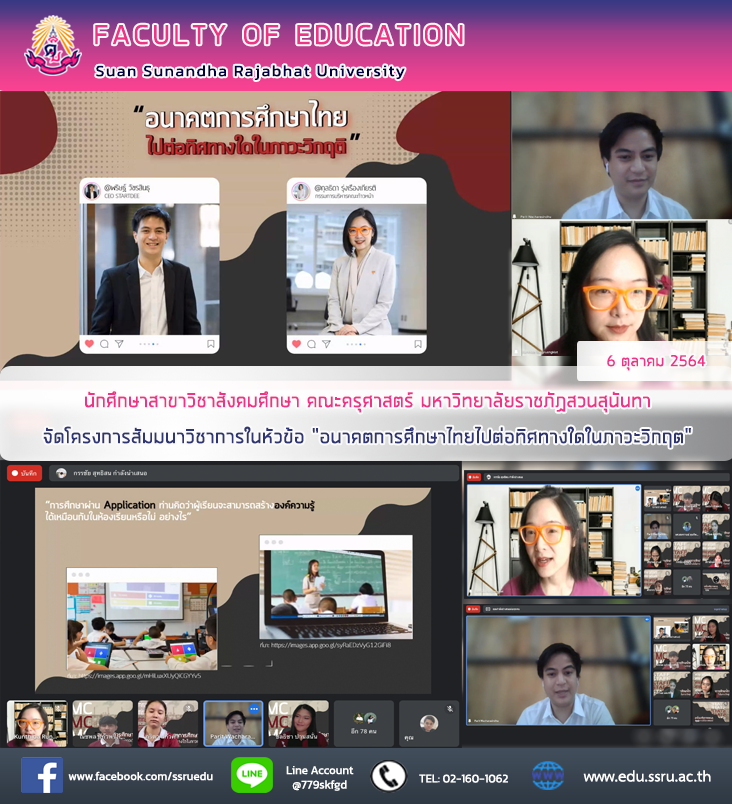 วันที่ 6 ตุลาคม 2564 นักศึกษาสาขาวิชาสังคมศึกษา คณะครุศาสตร์ มหาวิทยาลัยราชภัฏสวนสุนันทา จัดโครงการสัมมนาวิชาการในหัวข้อ "อนาคตการศึกษาไทยไปต่อทิศทางใดในภาวะวิกฤต" โดยได้รับเกียรติจาก นายพริษฐ์ วัชรสินธุ CEO STARTDEE และ กุลธิดา รุ่งเรืองเกียรติ กรรมการบริหารคณะก้าวหน้า เป็นวิทยากรในการจัดการสัมมนาให้กับนักศึกษาสาขาวิชาสังคมศึกษา
