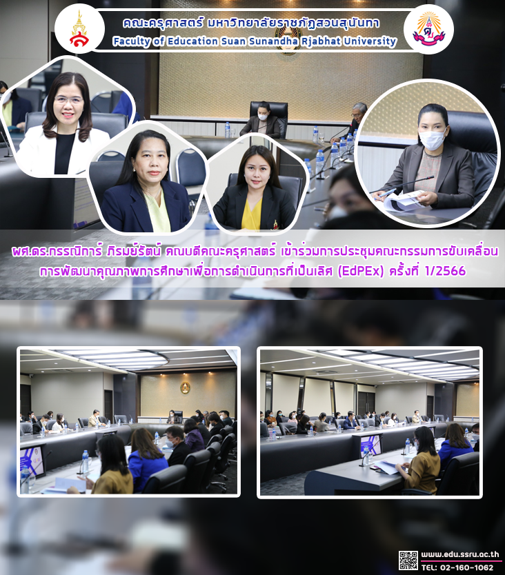 วันที่ 6 กุมภาพันธ์ 2566 เวลา 13.30 น. คณะครุศาสตร์ มหาวิทยาลัยราชภัฏสวนสุนันทา นำโดย ผู้ช่วยศาสตราจารย์ ดร.กรรณิการ์ ภิรมย์รัตน์ คณบดีคณะครุศาสตร์ ผู้ช่วยศาสตราจารย์ ดร.บุญฤดี อุดมผล รองคณบดีฝ่ายแผนและประกันคุณภาพ และนางสาวภัทรพร หัสดี เจ้าหน้าที่ฝ่ายแผนงานและประกันคุณภาพ เข้าประชุมคณะกรรมการขับเคลื่อนการพัฒนาคุณภาพการศึกษาเพื่อการดำเนินการที่เป็นเลิศ (EdPEx) มหาวิทยาลัยราชภัฏสวนสุนันทา ครั้งที่ 1/2566 โดยมี รศ.ดร.ชุติกาญจน์ ศรีวิบูลย์ อธิการบดี เป็นประธาน ณ ห้องประชุมสภามหาวิทยาลัย อาคาร 31 ชั้น 5