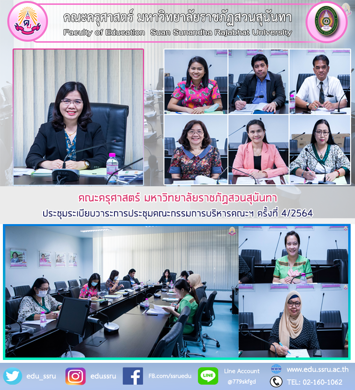 วันที่ 7 เมษายน 2564 ผู้ช่วยศาสตราจารย์ ดร.กรรณิการ์ ภิรมย์รัตน์ คณบดีคณะครุศาสตร์ มหาวิทยาลัยราชภัฏสวนสุนันทา พร้อมด้วยผู้บริหารของคณะฯ เข้าร่วมการประชุมระเบียบวาระการประชุมคณะกรรมการบริหารคณะฯ ครั้งที่ 4/2564 ณ ห้องประชุม 1124