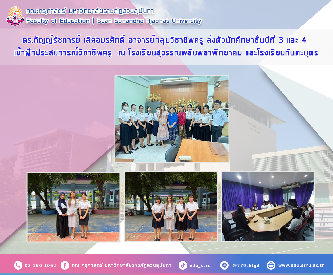 เมื่อวันที่ 5 มิถุนายน 2567 ดร.กัญญ์รัชการย์ เลิศอมรศักดิ์ อาจารย์กลุ่มวิชาชีพครู คณะครุศาสตร์ มหาวิทยาลัยราชภัฏสวนสุนันทา ส่งตัวนักศึกษาชั้นปีที่ 3 และ 4 เข้าฝึกประสบการณ์วิชาชีพครู ณ โรงเรียนสุวรรณพลับพลาพิทยาคม และโรงเรียนกันตะบุตร
