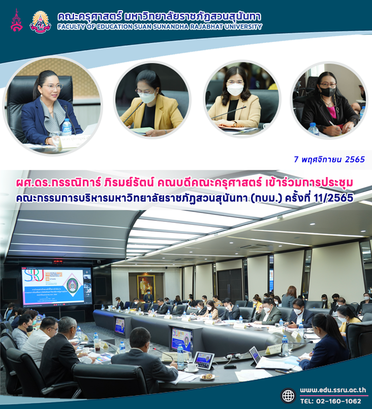 วันจันทร์ที่ 7 พฤศจิกายน 2565 เวลา 09.30 - 12.00 น. ผู้ช่วยศาสตราจารย์ ดร.กรรณิการ์ ภิรมย์รัตน์ คณบดีคณะครุศาสตร์ มหาวิทยาลัยราชภัฏสวนสุนันทา และนางรวินันท์ พระยาน้อย หัวหน้าสำนักงานฯ เข้าร่วมการประชุมคณะกรรมการบริหารมหาวิทยาลัยราชภัฏสวนสุนันทา (กบม.) ครั้งที่ 11/2565 โดยมีรองศาสตราจารย์ ดร.ชุติกาญจน์ ศรีวิบูลย์ อธิการบดีมหาวิทยาลัยราชภัฏสวนสุนันทา เป็นประธานการประชุม ณ ห้องประชุมสภามหาวิทยาลัย อาคาร 31 ชั้น 5 และผ่านระบบออนไลน์ Google Meet