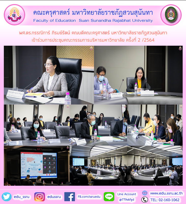 วันที่ 8 กุมภาพันธ์ 2564 ผู้ช่วยศาสตราจารย์ ดร.กรรณิการ์ ภิรมย์รัตน์ คณบดีคณะครุศาสตร์ มหาวิทยาลัยราชภัฏสวนสุนันทา เข้าร่วมการประชุมคณะกรรมการบริิหารมหาวิทยาลัย ครั้งที่ 2 /2564 ณ ห้องประชุมสภามหาวิทยาลัย อาคาร 31 ชั้น 5