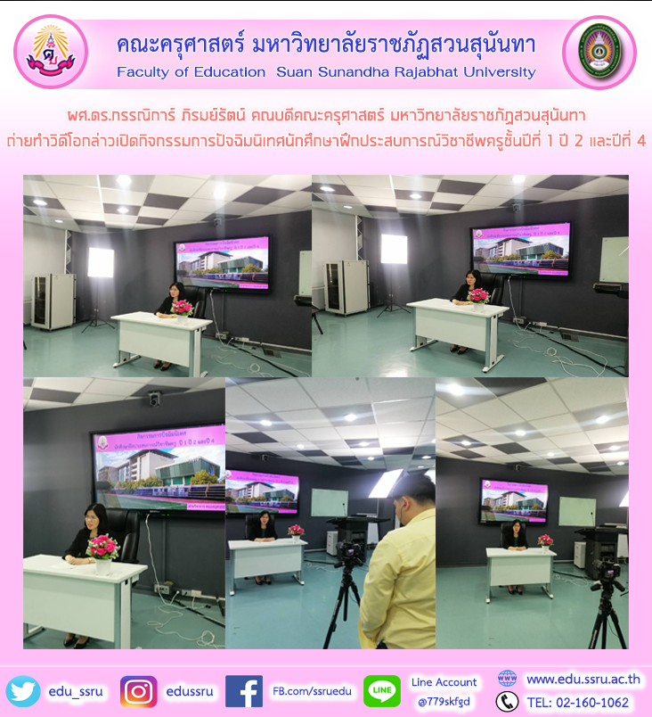 วันที่ 8 กุมภาพันธ์ 2564 ผู้ช่วยศาสตราจารย์ ดร.กรรณิการ์ ภิรมย์รัตน์ คณบดีคณะครุศาสตร์ มหาวิทยาลัยราชภัฏสวนสุนันทา ถ่ายทำวิดีโอกล่าวเปิดกิจกรรมการปัจฉิมนิเทศนักศึกษาฝึกประสบการณ์วิชาชีพครูชั้นปีที่ 1 ปี 2 และปีที่ 4 ณ ห้อง 1136