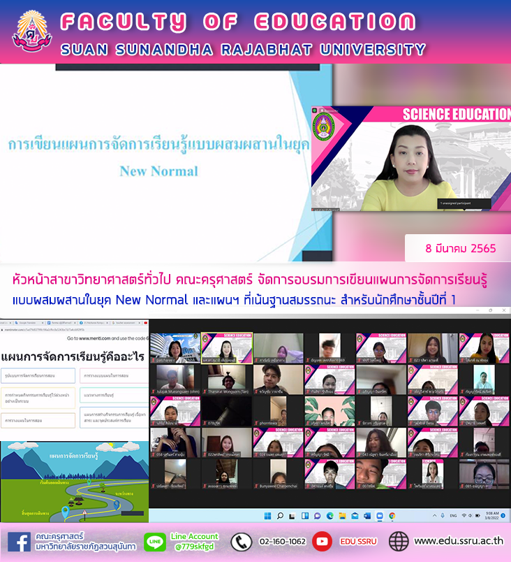 วันที่ 8 มีนาคม 2565 หัวหน้าสาขาวิทยาศาสตร์ทั่วไป คณะครุศาสตร์ ผู้ช่วยศาสตราจารย์ ดร. สุมาลี เทียนทองดี จัดกิจกรรมโครงการอบรมการเขียนแผนการจัดการเรียนรู้แบบผสมผสานในยุค New Normal สำหรับนักศึกษาชั้นปีที่ 1 โดยได้รับเกียรติจากผู้ช่วยศาสตราจารย์ ดร. พัชรี ร่มพยอม วิชัยดิษฐ จากสาขาวิชาวิทยาศาสตร์ศึกษา คณะวิทยาศาสตร์และเทคโนโลยี มหาวิทยาลัยราชภัฏเทพสตรี มาเป็นวิทยากรในการบรรยาย ผ่านระบบออนไลน์โปรแกรม zoom