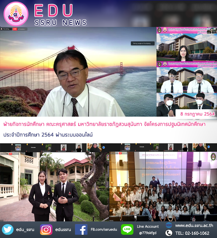 วันที่ 8 กรกฎาคม 2564 ผู้ช่วยศาสตราจารย์สงกรานณ์ ขุนทิพย์ทอง รองคณบดีฝ่ายกิจการนักศึกษา คณะครุศาสตร์ มหาวิทยาลัยราชภัฏสวนสุนันทา จัดโครงการปฐมนิเทศนักศึกษา ประจำปีการศึกษา 2564 ผ่านระบบออนไลน์