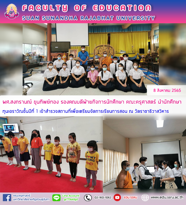 วันที่ 7 สิงหาคม 2565 ผู้ช่วยศาสตราจารย์สงกรานณ์ ขุนทิพย์ทอง รองคณบดีฝ่ายกิจการนักศึกษา คณะครุศาสตร์ มหาวิทยาลัยราชภัฏสวนสุนันทา นำนักศึกษาทุนเอราวัณชั้นปีที่ 1 จำนวน 10 คน เข้าสำรวจสถานที่เพื่อเตรียมจัดการเรียนการสอนนักเรียนศูนย์พุทธศาสนาวันอาทิตย์ ณ วัดราชาธิวาสวิหาร