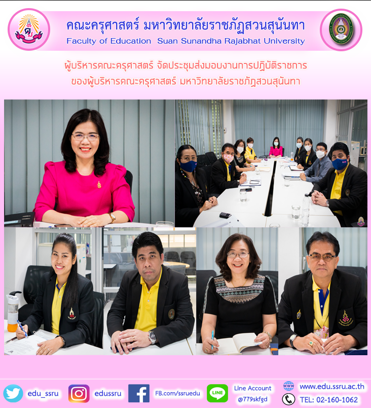 วันที่ 8 ธันวาคม 2563 ผู้ช่วยศาสตราจารย์ ดร.กรรณิการ์ ภิรมย์รัตน์ คณบดีคณะครุศาสตร์ มหาวิทยาลัยราชภัฏสวนสุนันทา จัดประชุมส่งมอบงานการปฏิบัติราชการของผู้บริหารคณะครุศาสตร์ มหาวิทยาลัยราชภัฏสวนสุนันทา ณ ห้องประชุมกรรณาภรณ์ สำนักงานคณบดีชั้น 3