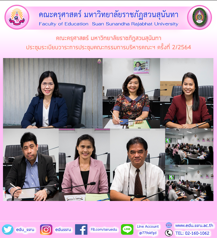 วันที่ 9 กุมภาพันธ์ 2564 ผู้ช่วยศาสตราจารย์ ดร.กรรณิการ์ ภิรมย์รัตน์ คณบดีคณะครุศาสตร์ มหาวิทยาลัยราชภัฏสวนสุนันทา พร้อมด้วยผู้บริหารของคณะฯ ประชุมระเบียบวาระการประชุมคณะกรรมการบริหารคณะฯ ครั้งที่ 2/2564 ณ ห้องประชุม 1124