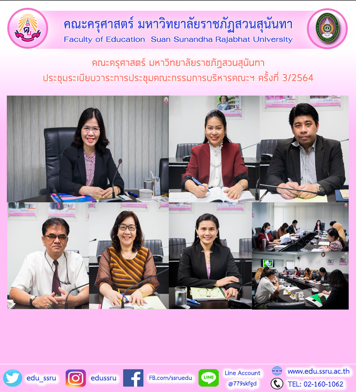 วันที่ 9 มีนาคม 2564 ผู้ช่วยศาสตราจารย์ ดร.กรรณิการ์ ภิรมย์รัตน์ คณบดีคณะครุศาสตร์ มหาวิทยาลัยราชภัฏสวนสุนันทา พร้อมด้วยผู้บริหารของคณะฯ เข้าร่วมการประชุมระเบียบวาระการประชุมคณะกรรมการบริหารคณะฯ ครั้งที่ 3/2564 ณ ห้องประชุม 1124