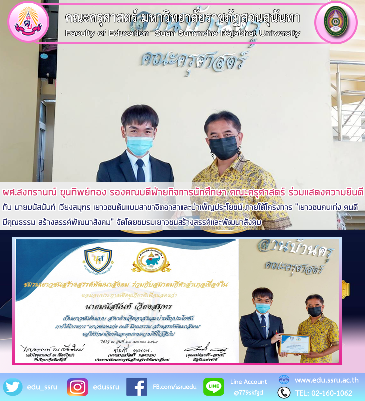 วันที่ 9 เมษายน 2564 ผู้ช่วยศาสตราจารย์ สงกรานณ์ ขุนทิพย์ทอง รองคณบดีฝ่ายกิจการนักศึกษา คณะครุศาสตร์ มหาวิทยาลัยราชภัฏสวนสุนันทา ร่วมแสดงความยินดีกับ นายมนัสนันท์ เวียงสมุทร ที่ได้รับเกียรติบัตรเยาวชนต้นแบบสาขาจิตอาสาและบำเพ็ญประโยชน์ ภายใต้โครงการ "เยาวชนคนเก่ง คนดี มีคุณธรรม สร้างสรรค์พัฒนาสังคม" จัดโดยชมรมเยาวชนสร้างสรรค์และพัฒนาสังคมร่วมกับสมาคมกีฬาอำเภอเขื่องใน ณ บริเวณลานบ้านครู คณะครุศาสตร์