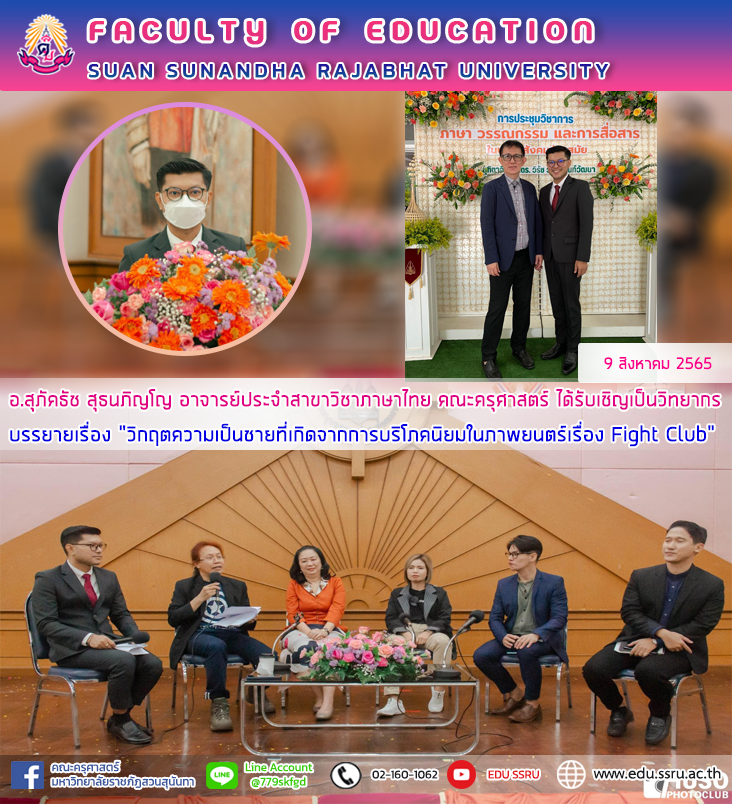 เมื่อวันที่ 5 สิงหาคม 2565 อาจารย์สุภัคธัช สุธนภิญโญ อาจารย์ประจำสาขาวิชาภาษาไทย คณะครุศาสตร์ มหาวิทยาลัยราชภัฏสวนสุนันทา ได้รับเชิญจาก สาขาวิชาภาษาไทย คณะมนุษยศาสตร์และสังคมศาสตร์ มหาวิทยาลัยขอนแก่น เป็นวิทยากรบรรยายเรื่อง “วิกฤตความเป็นชายที่เกิดจากการบริโภคนิยมในภาพยนตร์เรื่อง Fight Club” โดยมีวัตุประสงค์เพื่อให้นักวิชาการ อาจารย์ และนักศึกษา ได้พัฒนาด้านการวิจัยและวิชาการ รวมทั้งได้มีโอกาสในการเผยแพร่องค์ความรู้ทางวิชาการและเพื่อแลกเปลี่ยนเรียนรู้เครือข่ายความร่วมมือทั้งภายในและภายนอกมหาวิทยาลัยขอนแก่น ณ คณะมนุษยศาสตร์และสังคมศาสตร์ มหาวิทยาลัยขอนแก่น
