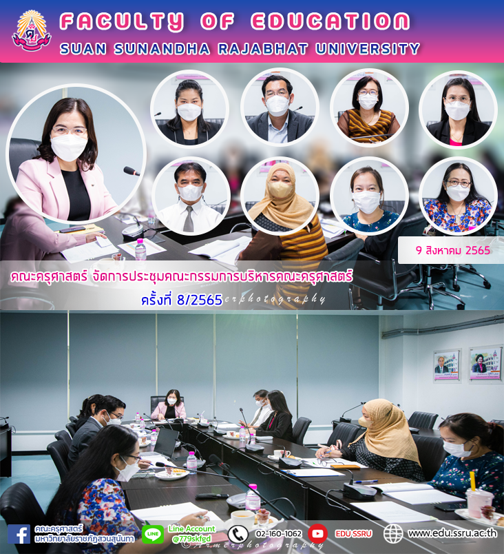 วันที่ 9 สิงหาคม 2565 เวลา 09.00 - 12.00 น. นำโดย ผู้ช่วยศาสตราจารย์ ดร.กรรณิการ์ ภิรมย์รัตน์ คณบดี พร้อมด้วยรองคณบดีทุกฝ่าย อาจารย์ ดร.ดวงกมล จงเจริญ ผู้อำนวยการศูนย์พัฒนาวิชาชีพทางการศึกษา ผู้ช่วยศาสตราจารย์ สุพันธ์วดี ไวยรูป ผู้อำนวยการศูนย์พัฒนาศักยภาพเด็กปฐมวัย และนางรวินันท์ พระยาน้อย หัวหน้าสำนักงาน คณะครุศาสตร์ มหาวิทยาลัยราชภัฏสวนสุนันทา จัดประชุมคณะกรรมการบริหารคณะครุศาสตร์ ครั้งที่ 8/2565 ณ ห้องประชุม 1124 อาคาร 11 คณะครุศาสตร์