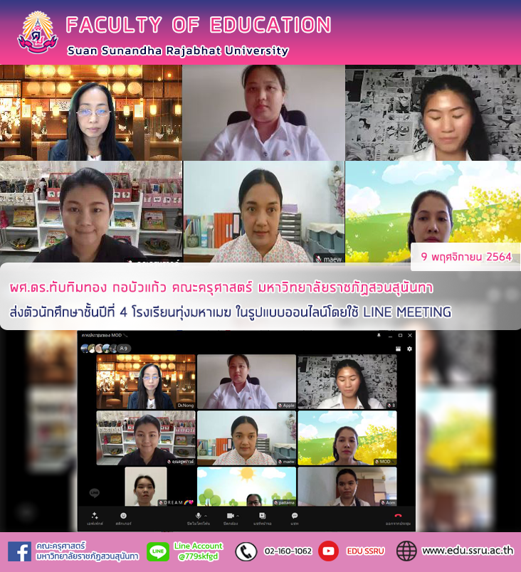 วันที่ 9 พฤศจิกายน 2564 เวลา 10.00 น. ผู้ช่วยศาสตราจารย์ ดร.ทับทิมทอง กอบัวแก้ว อาจารย์ประจำสาขาวิชาเทคโนโลยีดิจิทัลเพื่อการศึกษา ส่งตัว นักศึกษาชั้นปีที่ 4 สาขาการศึกษาปฐมวัย 3 คน สาขาเทคโนโลยีการศึกษาและคอมพิวเตอร์ 1 คน เข้าสังเกตการณ์การสอน ณ โรงเรียนทุ่งมหาเมฆ ในรูปแบบออนไลน์ โดยใช้ LINE MEETING