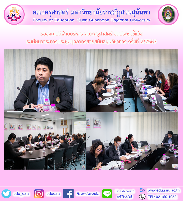 วันที่ 9 ธันวาคม 2563 อาจารย์ ดร.ศิลป์ชัย พูลคล้าย รองคณบดีฝ่ายบริหาร คณะครุศาสตร์ มหาวิทยาลัยราชภัฏสวนสุนันทา จัดประชุมชี้แจ้งระเบียบวาระการประชุมบุคลากรสายสนับสนุนวิชาการ ครั้งที่ 2/2563 เพื่อติดตามตัวชี้วัดของแต่ละฝ่าย ณ ห้องประชุม 1124