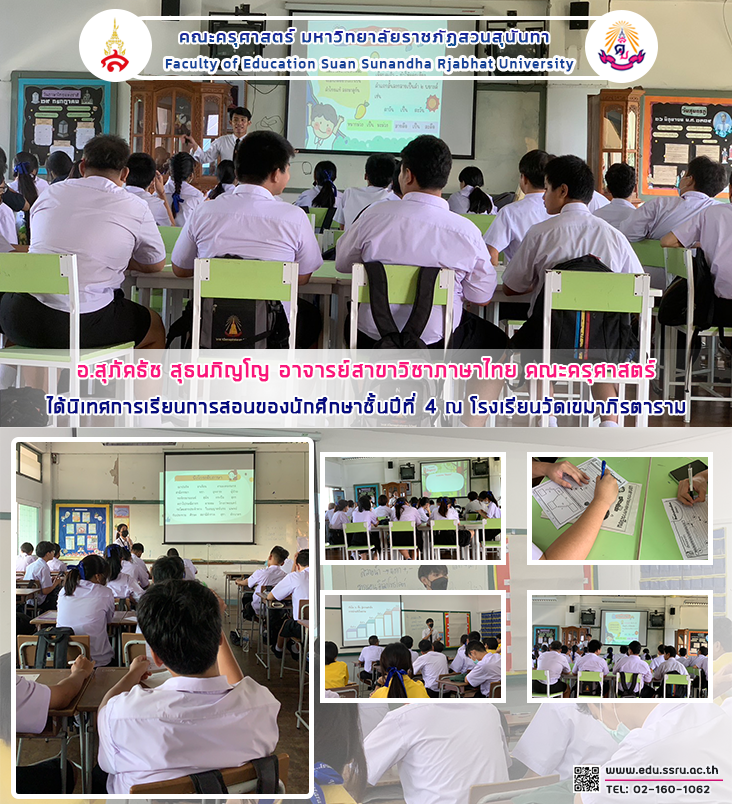 วันที่ 9 ธันวาคม 2565 อาจารย์สุภัคธัช สุธนภิญโญ อาจารย์สาขาวิชาภาษาไทย คณะครุศาสตร์ มหาวิทยาลัยราชภัฏสวนสุนันทา ได้นิเทศการเรียนการสอนของนักศึกษาชั้นปีที่ 4 ณ โรงเรียนวัดเขมาภิรตาราม จ.นนทบุรี