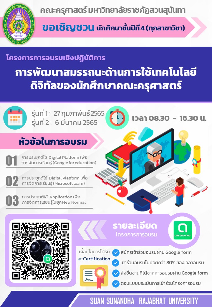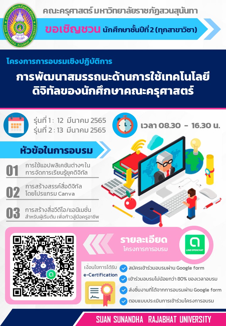คณะครุศาสตร์ มหาวิทยาลัยราชภัฏสวนสุนันทา ขอเชิญชวนนักศึกษาชั้นปีที่ 2 และนักศึกษาชั้นปีที่ 4 ทุกสาขาวิชา (กิจกรรมบังคับ) โครงการการอบรมเชิงปฏิบัติการการพัฒนาสมรรถนะด้านการใช้เทคโนโลยีดิจิทัลของนักศึกษาคณะครุศาสตร์ เพื่อพัฒนานักศึกษาครูให้มีสมรรถนะตามวิชาชีพครู ด้านการใช้เทคโนโลยีดิจิทัลเพื่อการศึกษาขั้นพื้นฐาน และสามารถประยุกต์ใช้ดิจิทัลในการจัดการเรียนการสอนได้เพื่อให้เกิดประโยชน์ต่อผู้เรียน